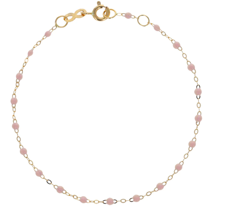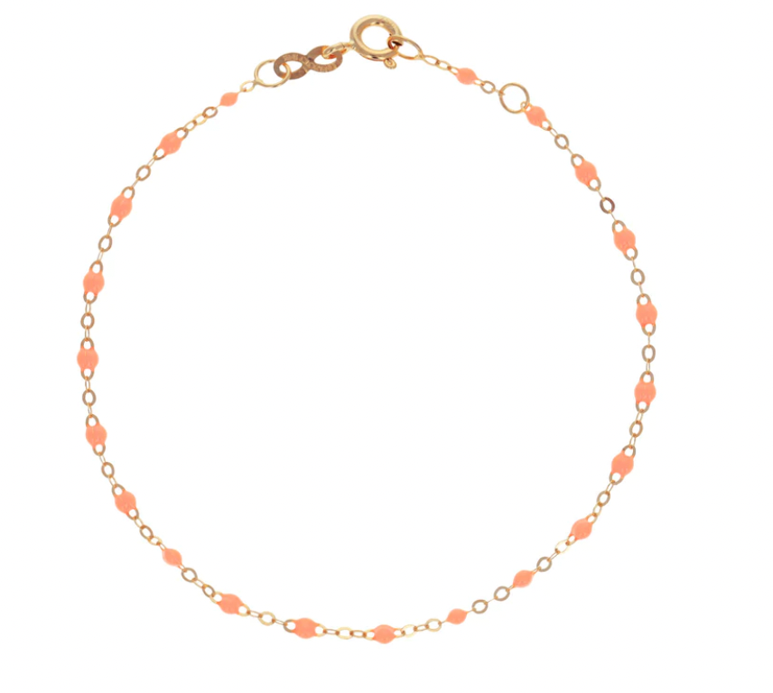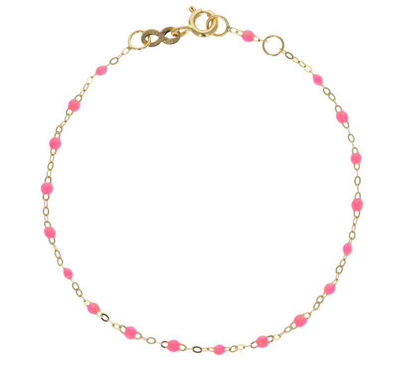Stunning in its cool toned color palette this Gigi Clozeau bracelet works with your more formal and your more casual outfits. The 18K yellow gold chain is interspersed with small colored resin beads. It closes with an 18K yellow gold spring ring clasp closure to create a bracelet perfect alone or layered with your other favorites.